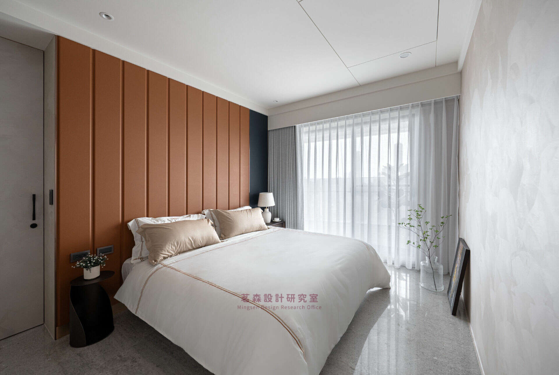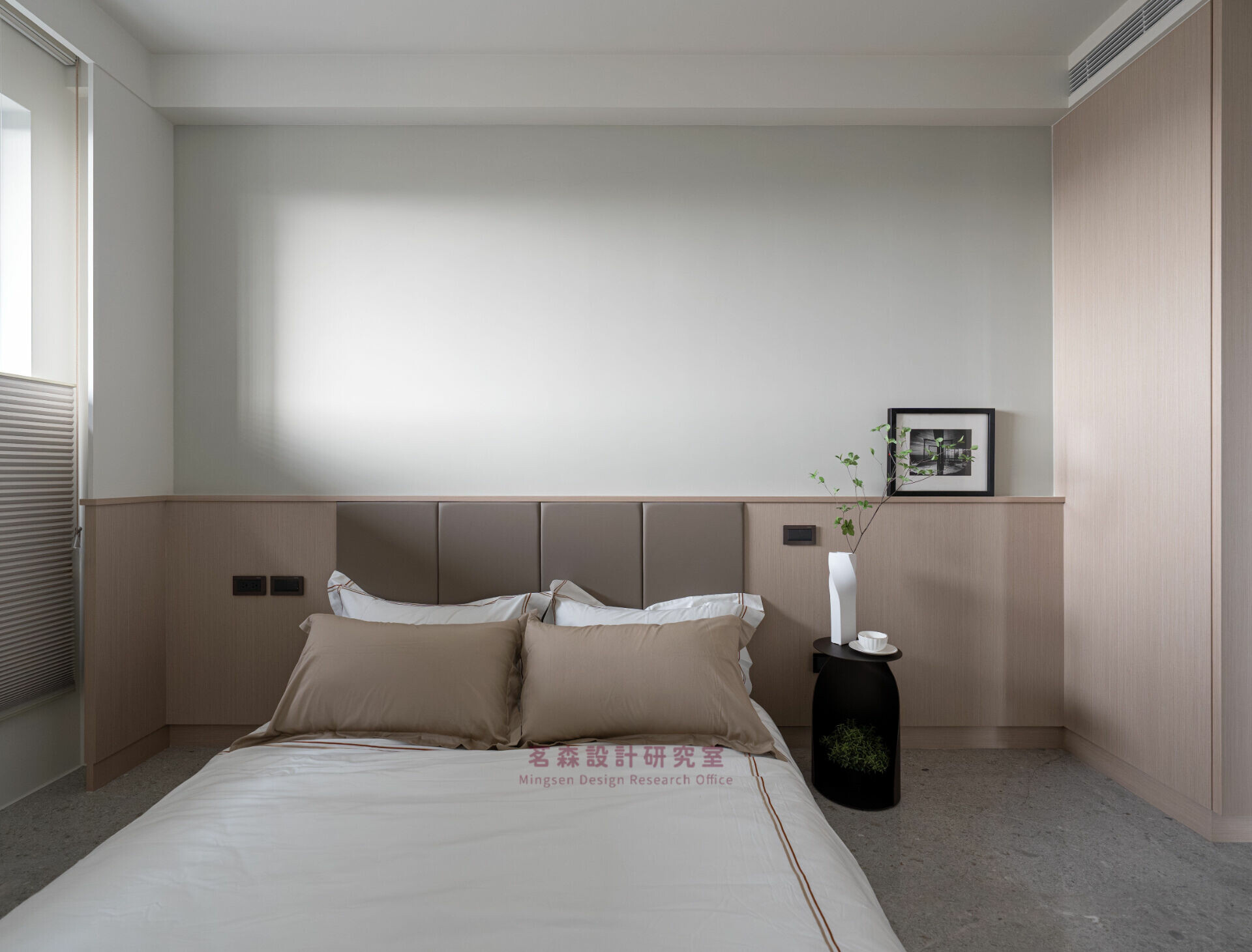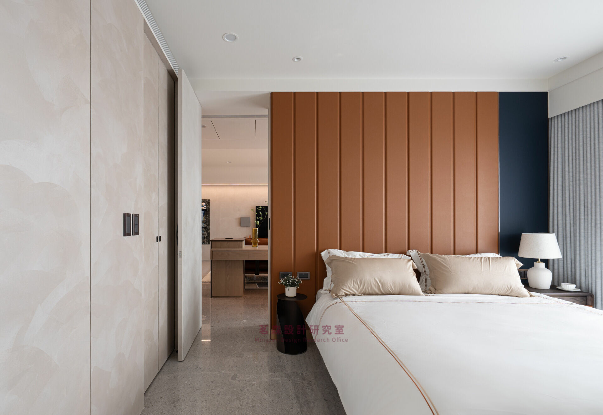 臥室以霧白與暖棕重置感官,成為釋放張力的療癒艙。