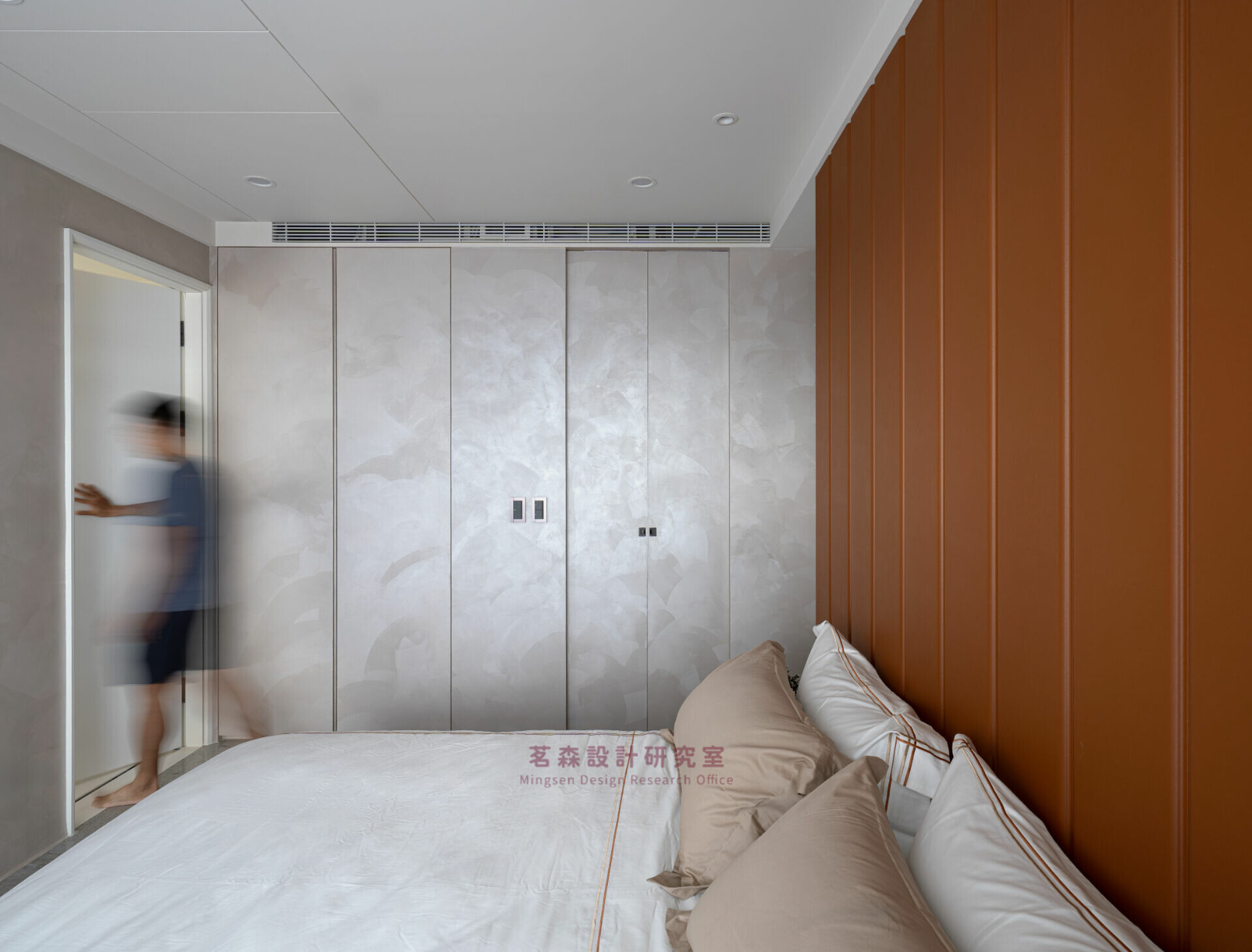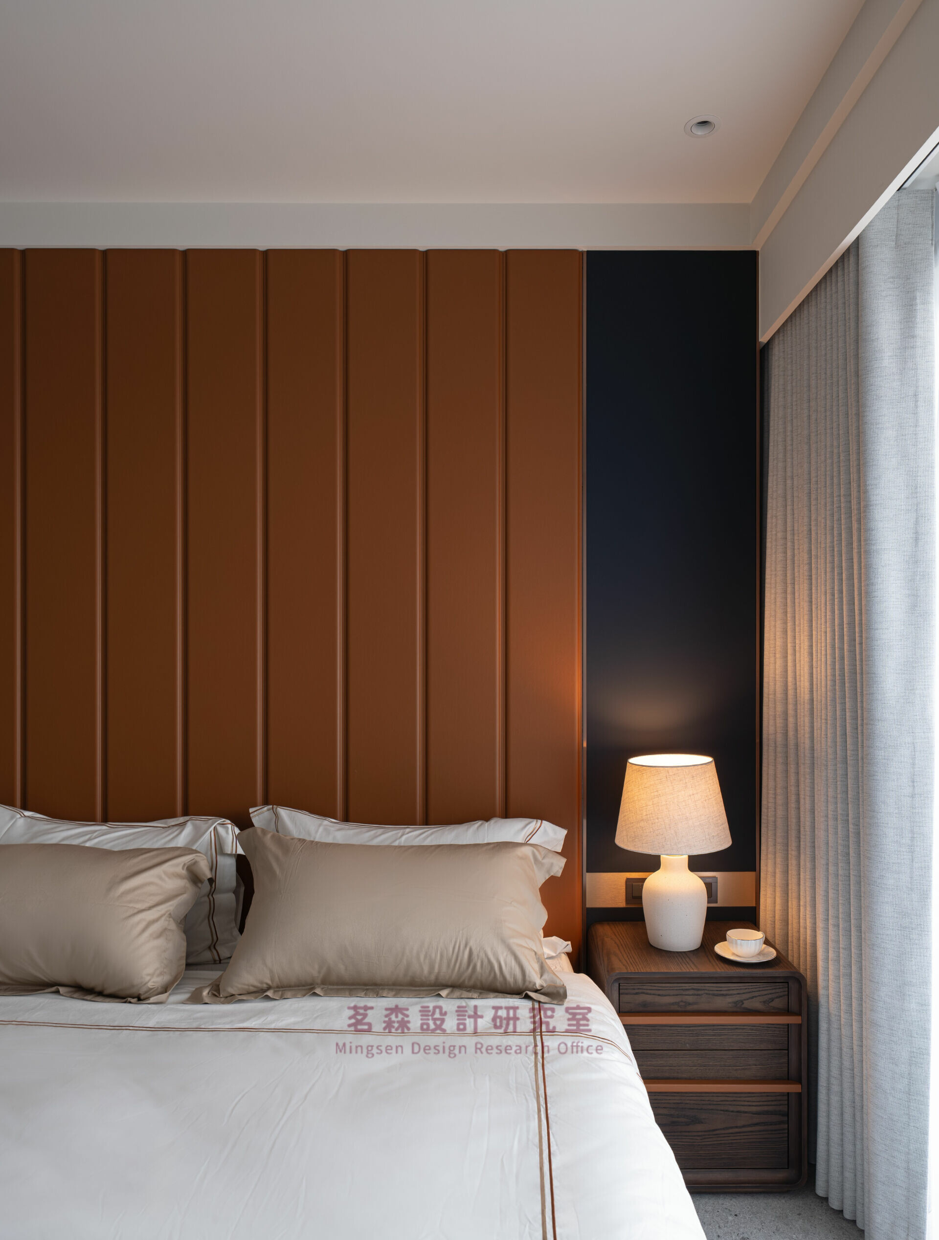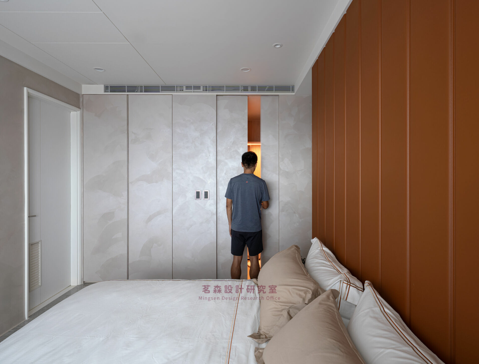 臥室以霧白與暖棕重置感官,成為釋放張力的療癒艙。