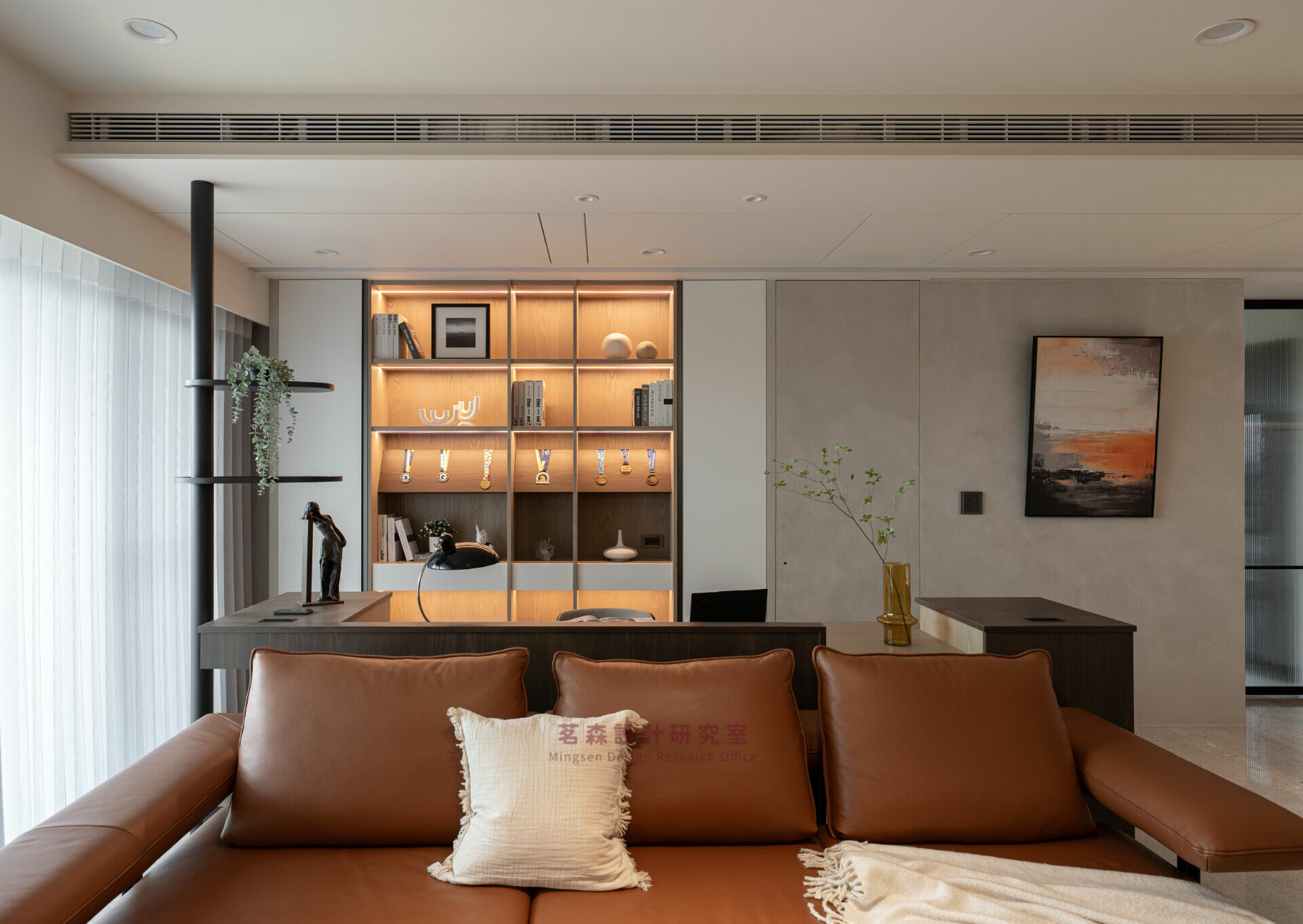 書桌與展示櫃是精神座標,暖光收斂如內在節律;