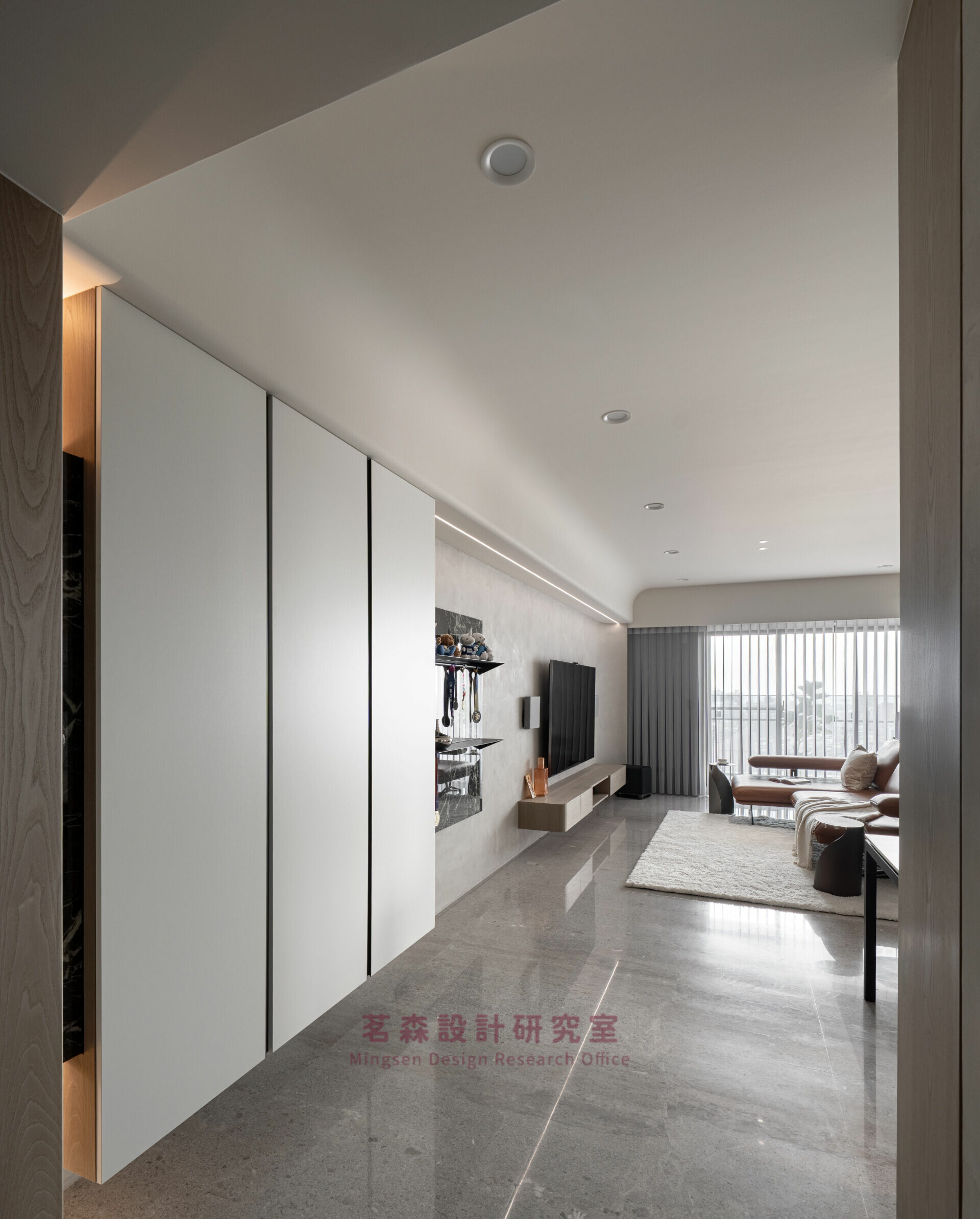 光沿軸線推移,落在石材與木皮之間,形成柔與實的平衡;