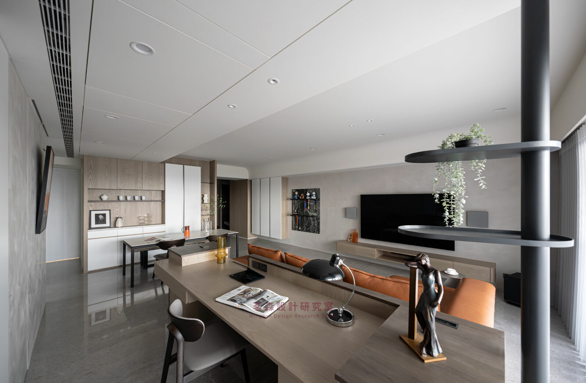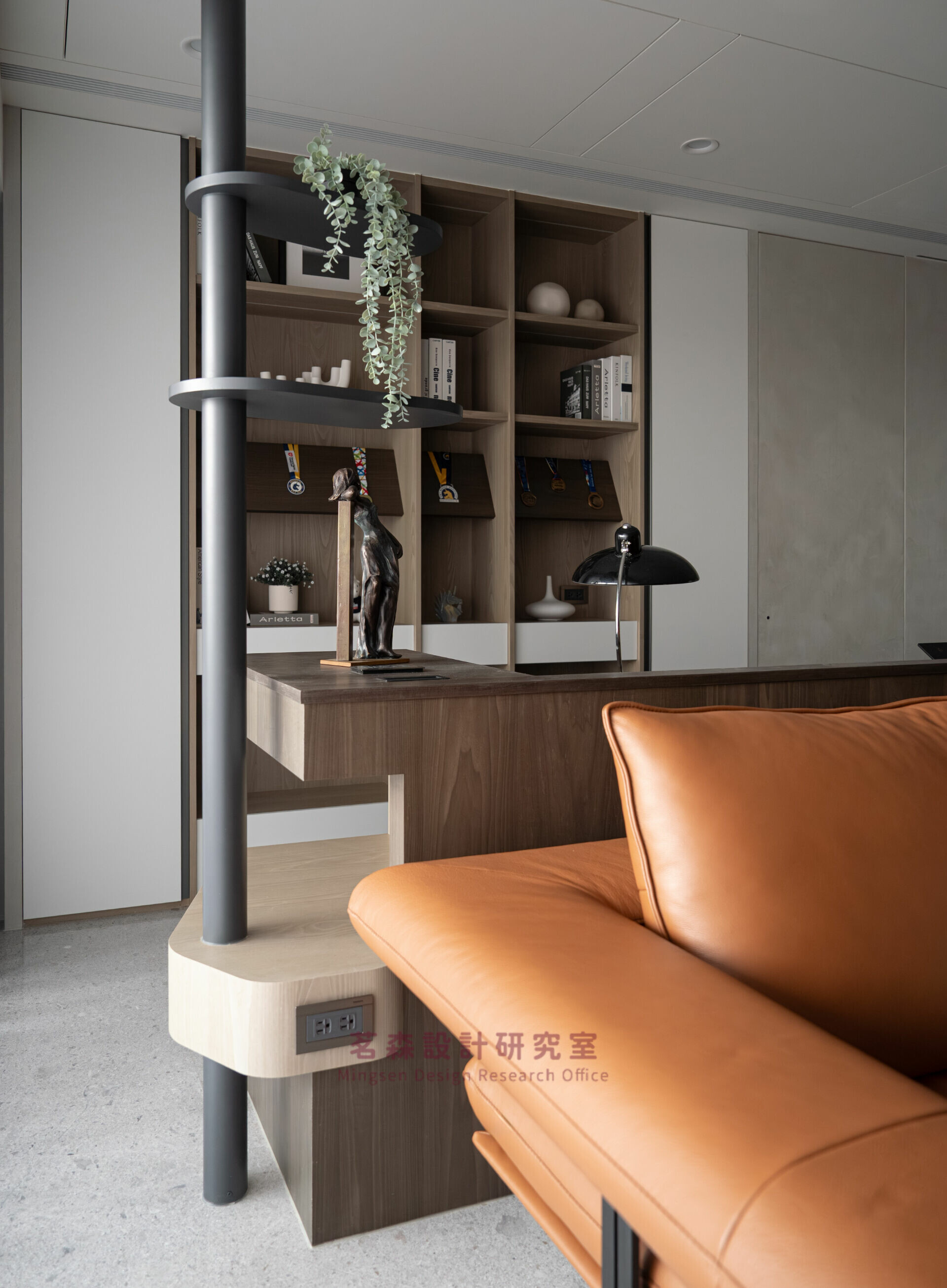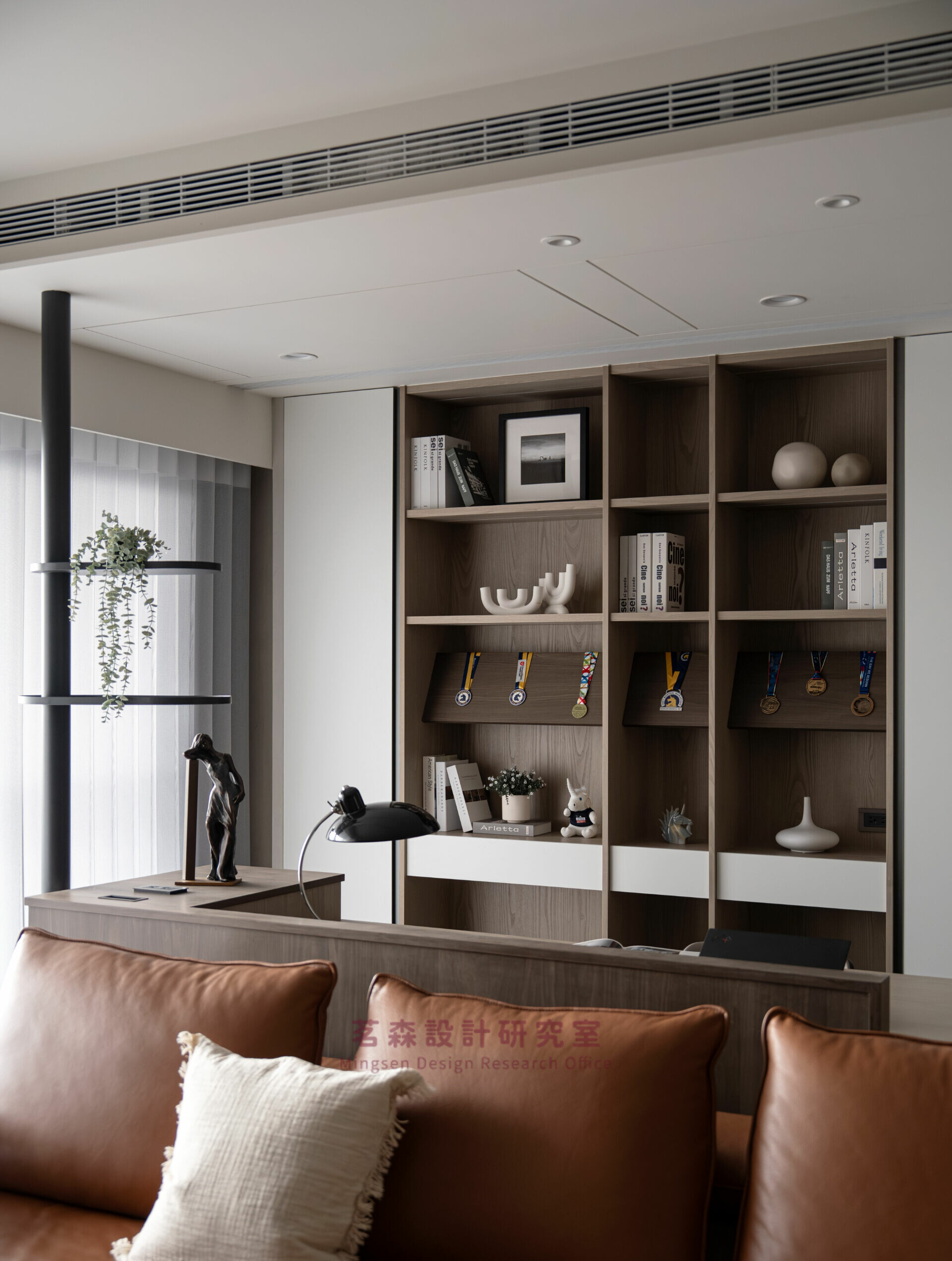 木色串聯沙發與書桌,留白讓空氣與思緒同步沉靜;